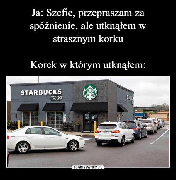 Ja: Szefie, przepraszam za spóźnienie, ale utknąłem w strasznym korku Korek w którym utknąłem: