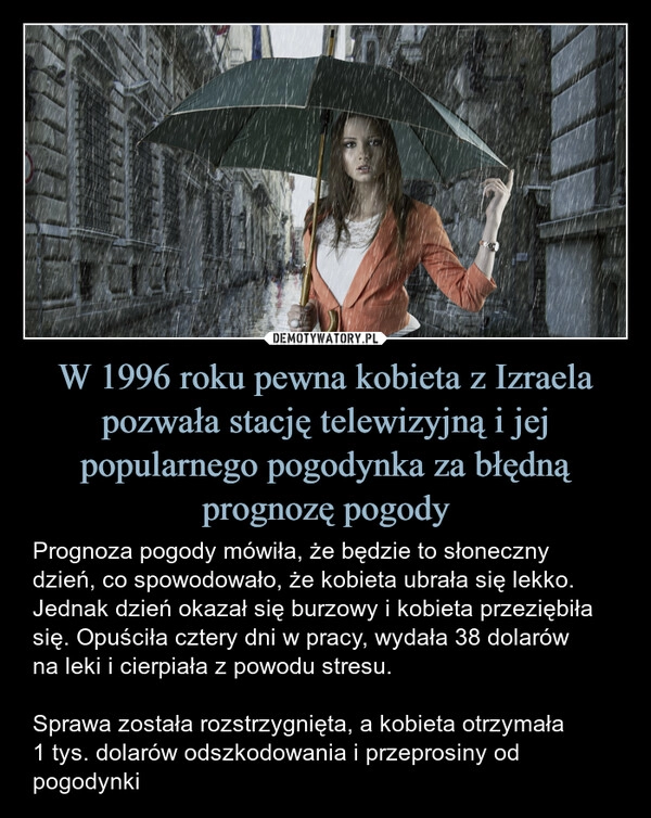 W 1996 roku pewna kobieta z Izraela pozwała stację telewizyjną i jej popularnego pogodynka za błędną prognozę pogody