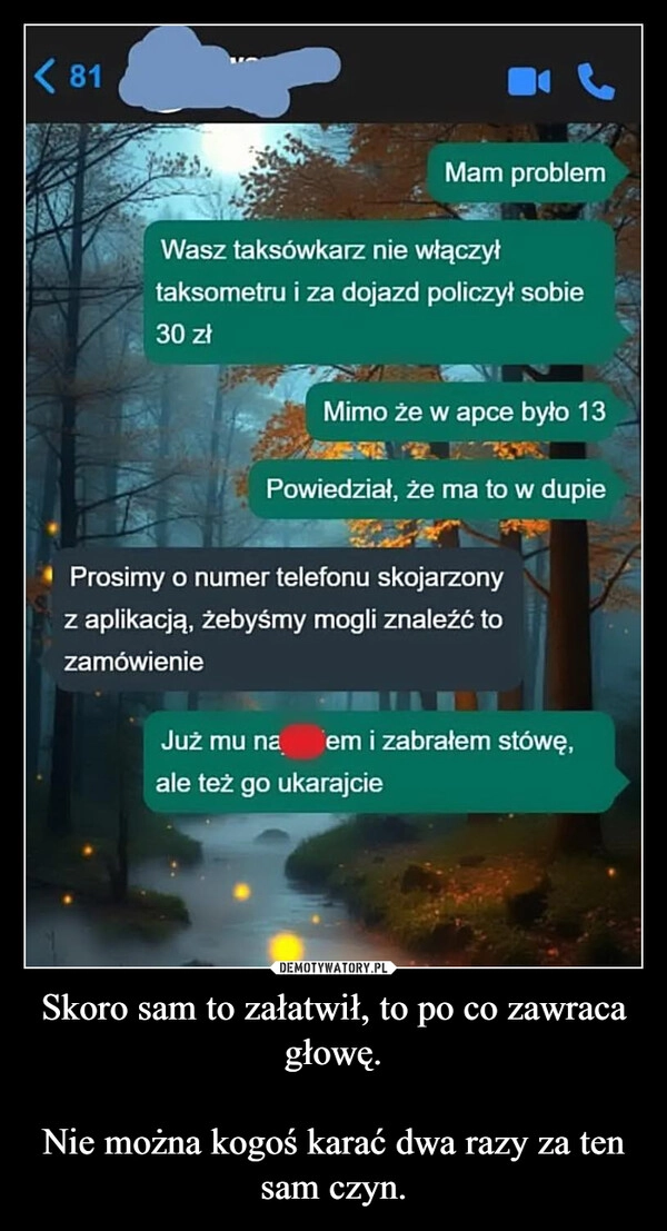 Skoro sam to załatwił, to po co zawraca głowę. Nie można kogoś karać dwa razy za ten sam czyn.