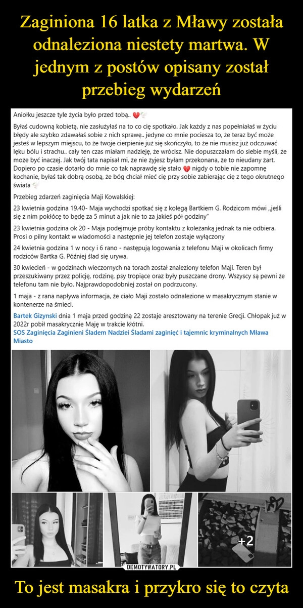 Zaginiona 16 latka z Mławy została odnaleziona niestety martwa. W jednym z postów opisany został przebieg wydarzeń To jest masakra i przykro się to czyta