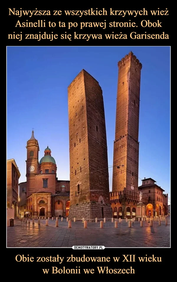 Najwyższa ze wszystkich krzywych wież Asinelli to ta po prawej stronie. Obok niej znajduje się krzywa wieża Garisenda Obie zostały zbudowane w XII wieku w Bolonii we Włoszech